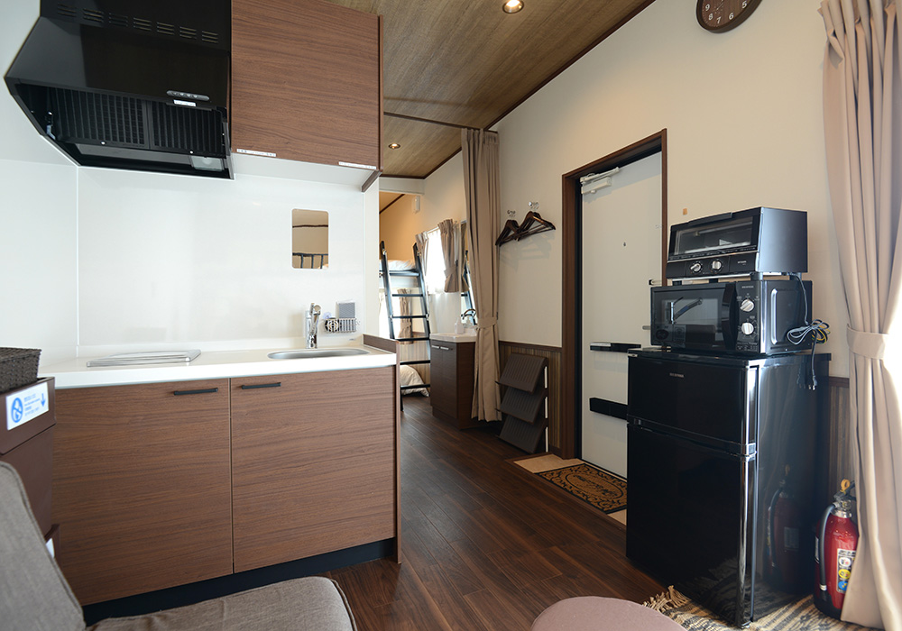 各棟共通の客室設備としてミニキッチン、冷蔵庫、電子レンジ、炊飯器、など連泊滞在にも不足ない充実の客室設備をご用意しております。